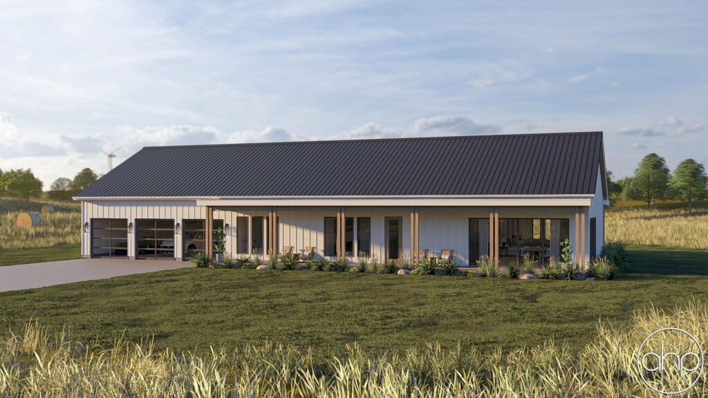 Large windows throughout the home flood the space with natural light, enhancing the airy feel of the 10-foot ceilings. The exterior’s barndominium aesthetic, with its mix of materials and clean lines, offers a modern-rustic vibe that’s easy to personalize.