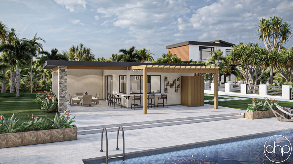 This pool house blends contemporary flair with practical comfort, offering a chic escape that enhances your home’s appeal and provides a peaceful spot to recharge.
