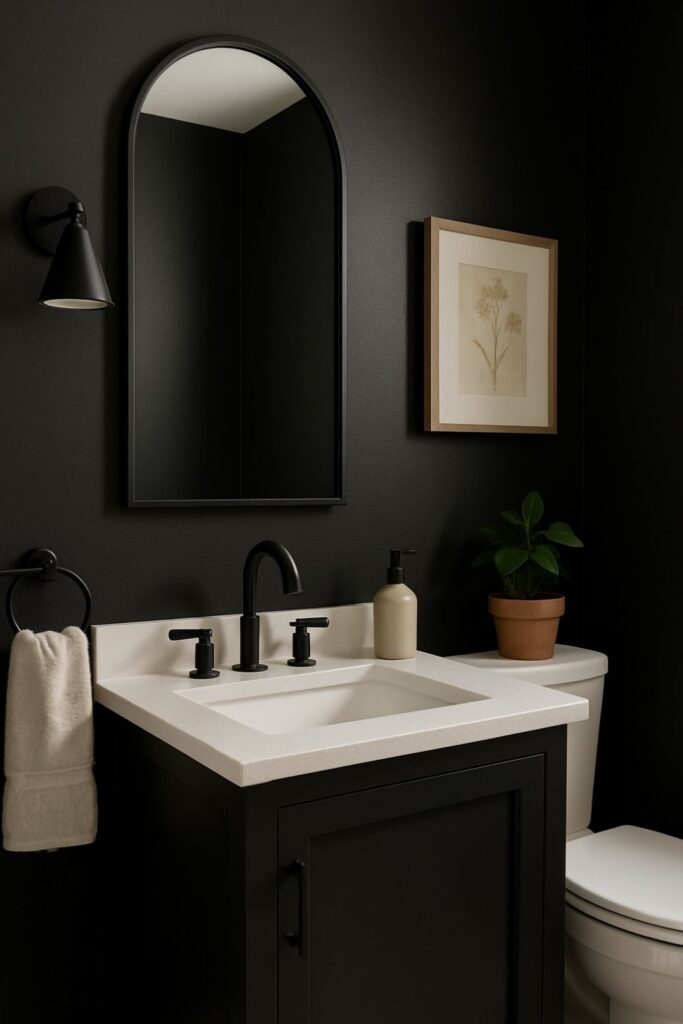 Give your bathroom an instant upgrade with matte black walls. It’s a daring choice that feels surprisingly cozy and intimate, especially when paired with warm wood cabinetry and soft ambient lighting.