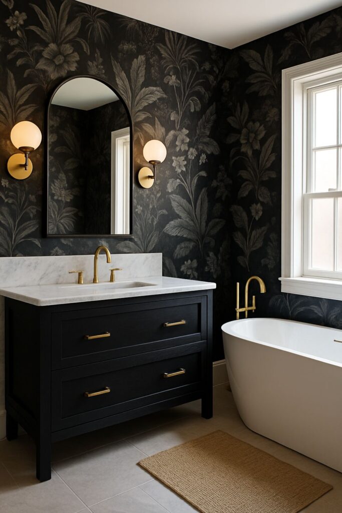 If solid black feels too intense, try wallpaper with black elements. Botanical prints, geometric patterns, or abstract designs in black and white bring style while softening the overall mood.