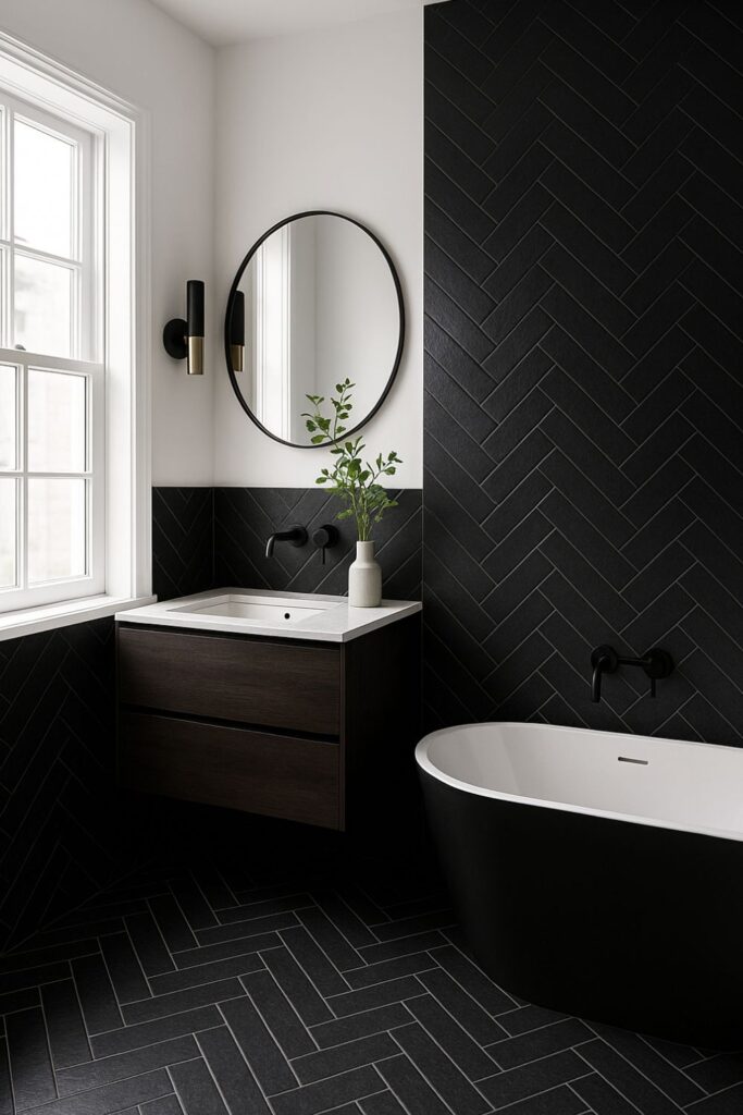 If you’re not ready to go full black, use it to contrast white walls. A black feature wall behind the vanity or tub creates visual drama while keeping the space bright and open.