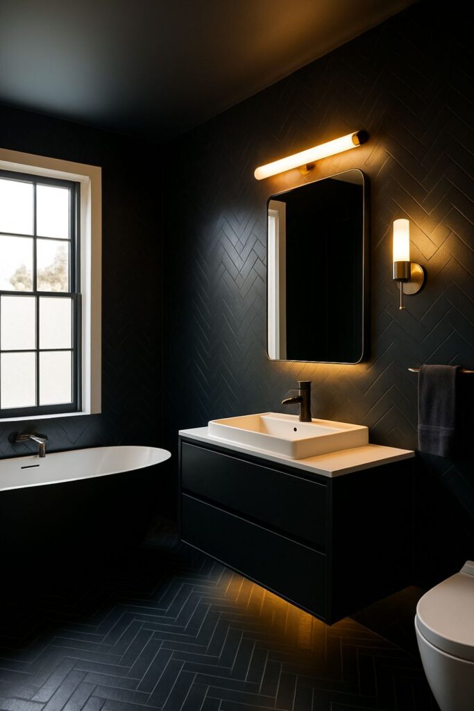 Lighting is key in a black bathroom. Use warm LED strips, wall sconces, or pendant lights to soften the look and prevent the space from feeling too stark or shadowy.