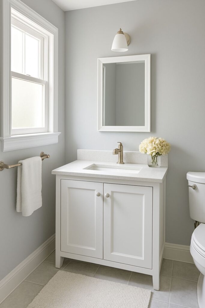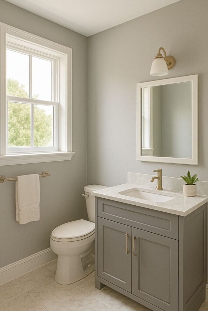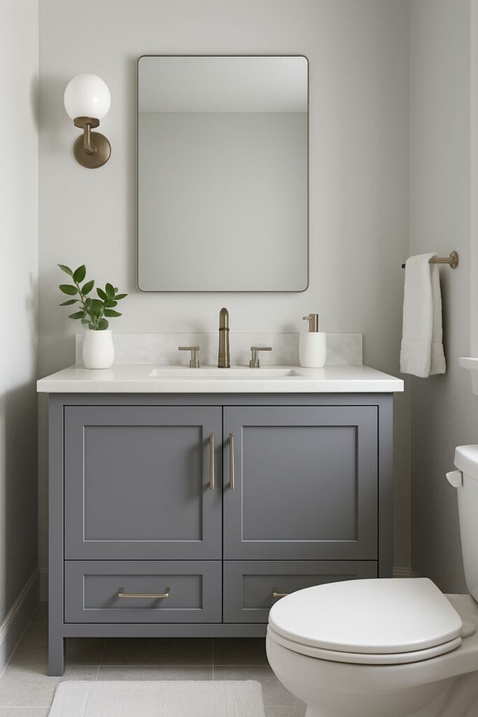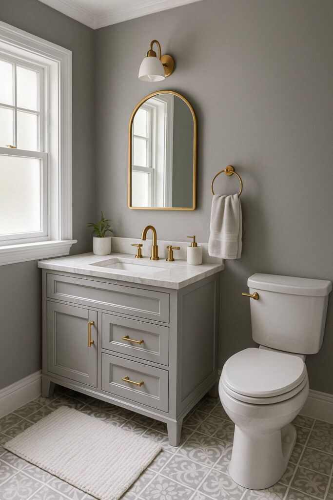 Gray loves a little contrast. Brass handles, mirror frames, and faucets add a touch of glam while keeping the space polished and elevated.
