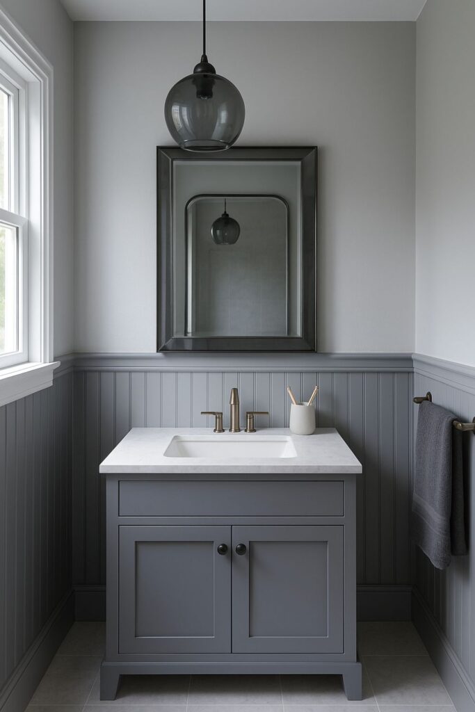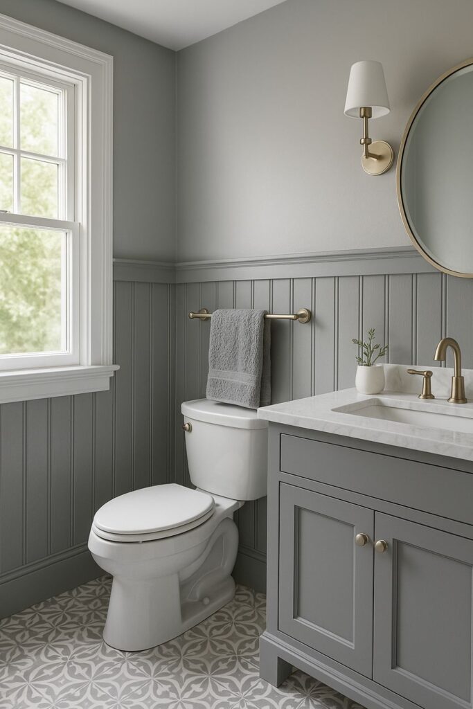 Add a traditional feel with gray-painted beadboard or board-and-batten walls. It’s perfect for vintage-inspired spaces and adds charm while protecting the walls from moisture.