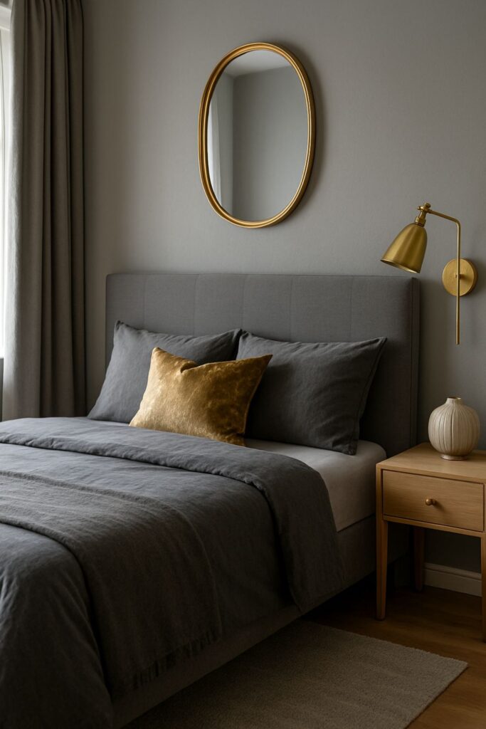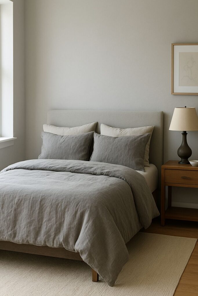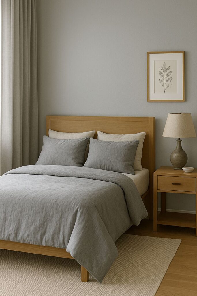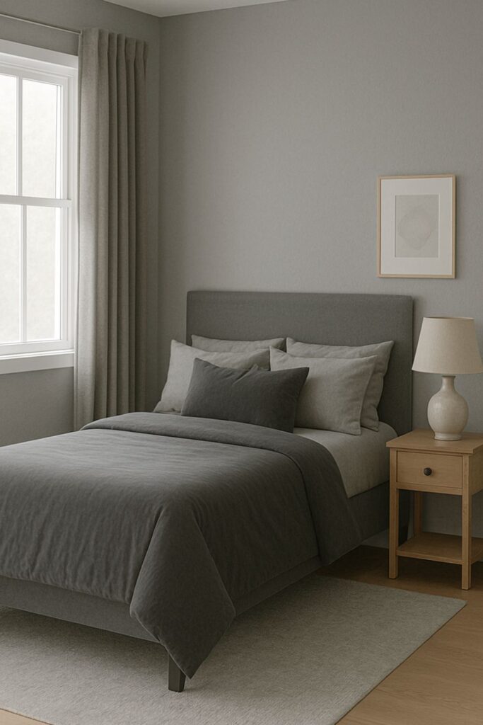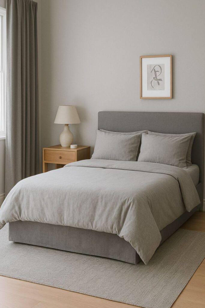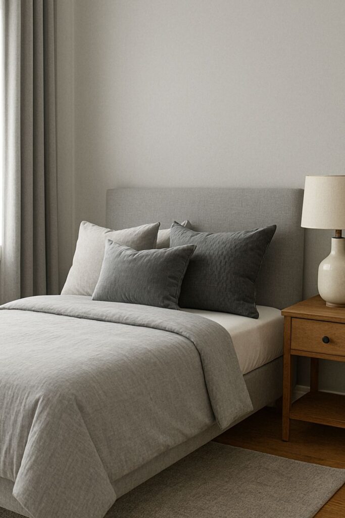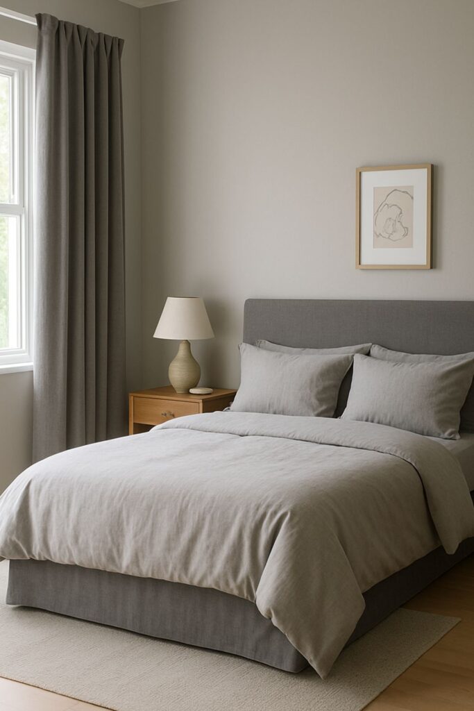 Opt for gray curtains—blackout for deep sleep or sheer for diffused daylight. In either case, they blend beautifully with the room’s palette and offer a soft, serene framing for windows.