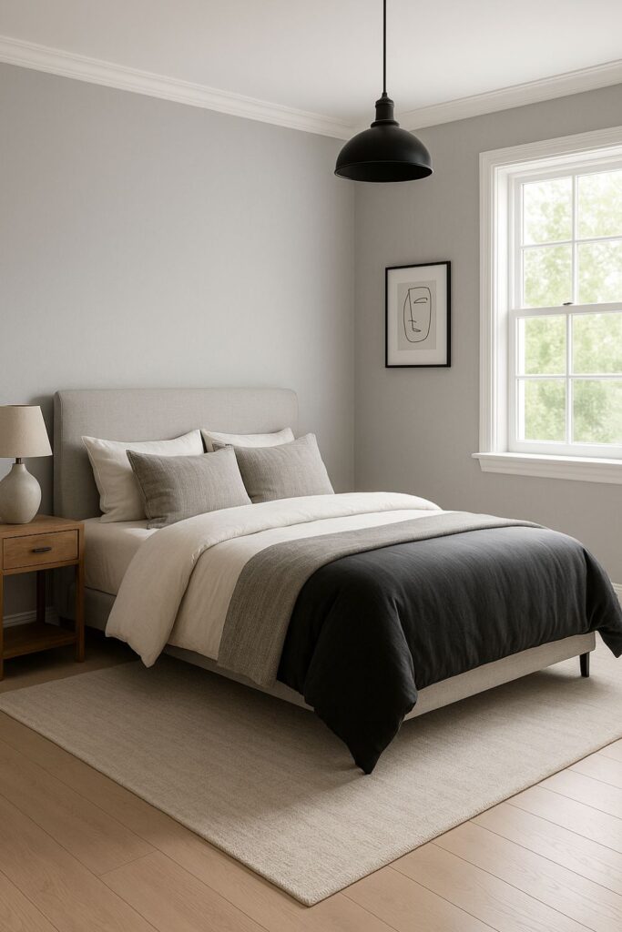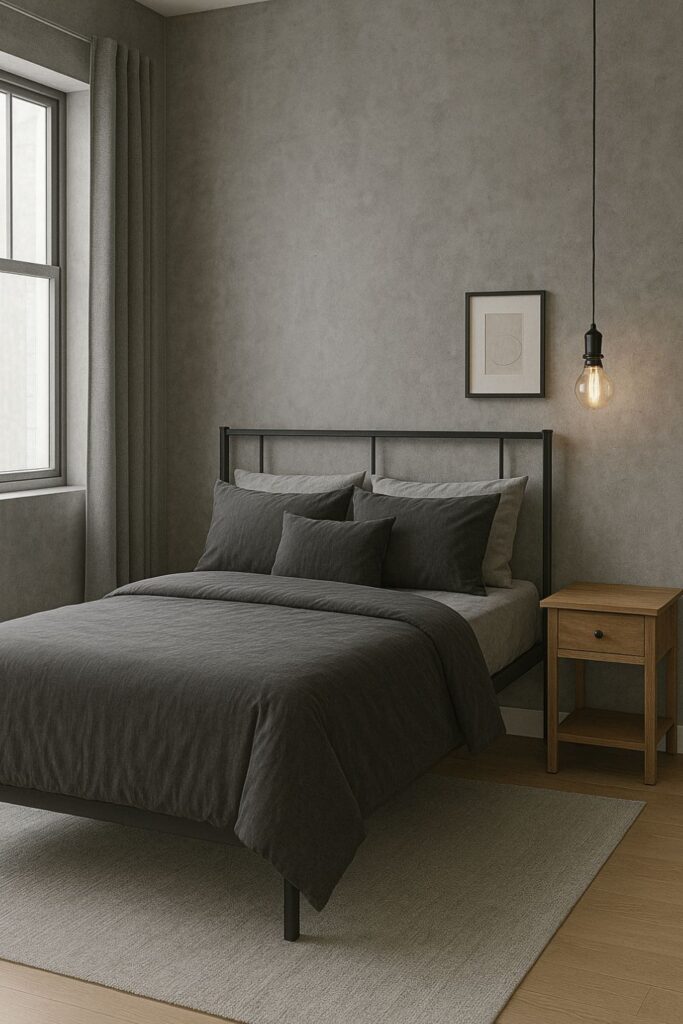 Go bold without going black. A deep charcoal wall behind the bed adds contrast and sophistication, especially when paired with white trim or light wood furniture. It draws the eye and anchors the entire room.