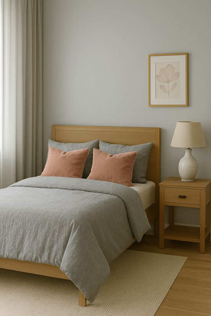 Pairing soft grays with muted pinks or blush accents creates a delicate, dreamy vibe. Think velvet blush pillows, dusty rose artwork, or a woven throw—all against a cool gray canvas.
