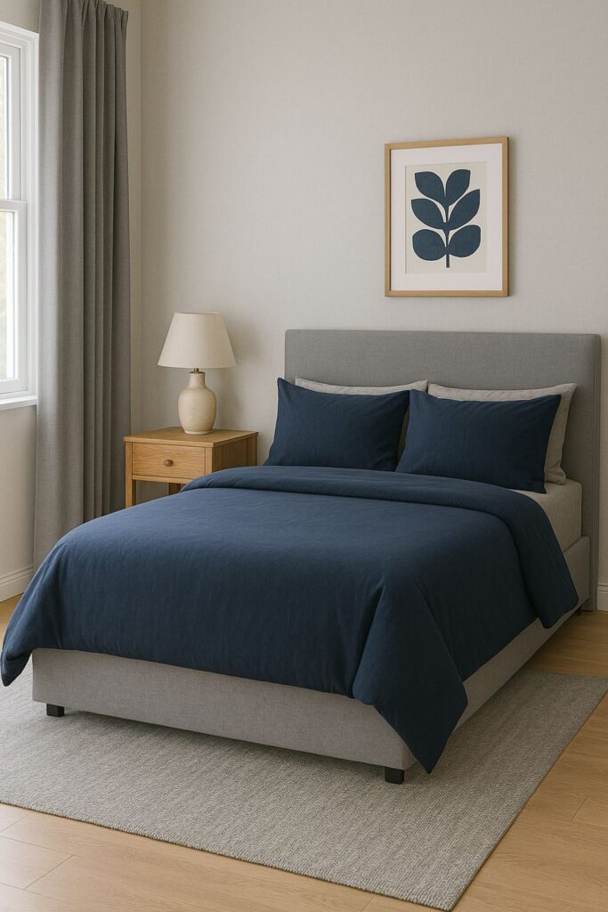 Navy blue and gray are a match made in moody heaven. Try navy bedding on a gray upholstered bed or navy wall art against a light gray wall. It’s rich, stylish, and ideal for a restful vibe.