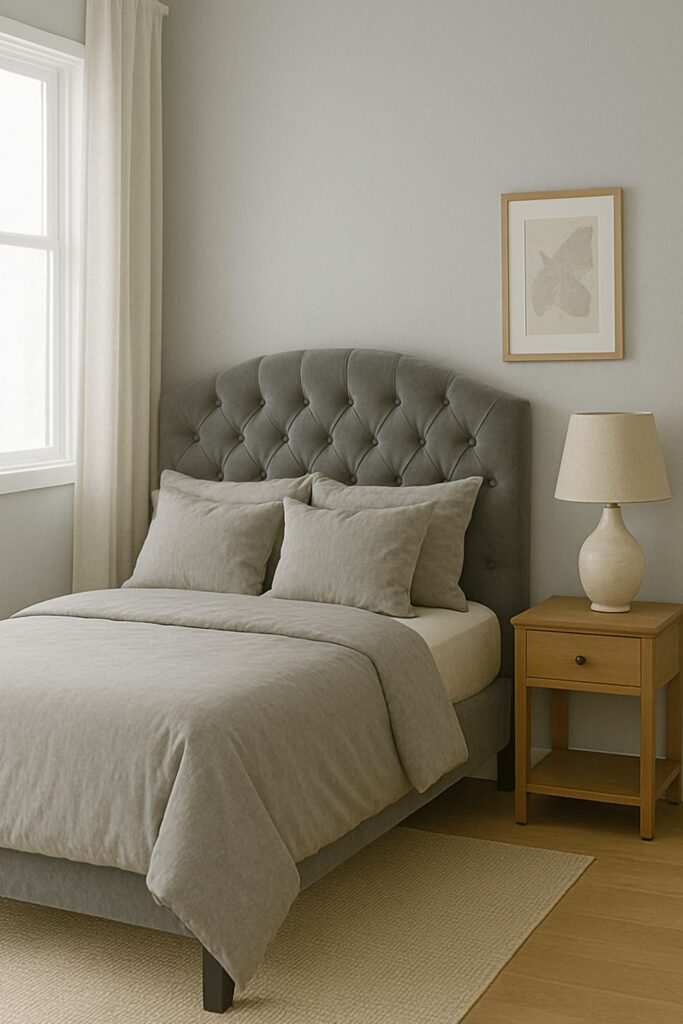Add instant elegance with a gray velvet headboard. Whether tufted or streamlined, velvet reflects light beautifully and provides a plush focal point for the bed.