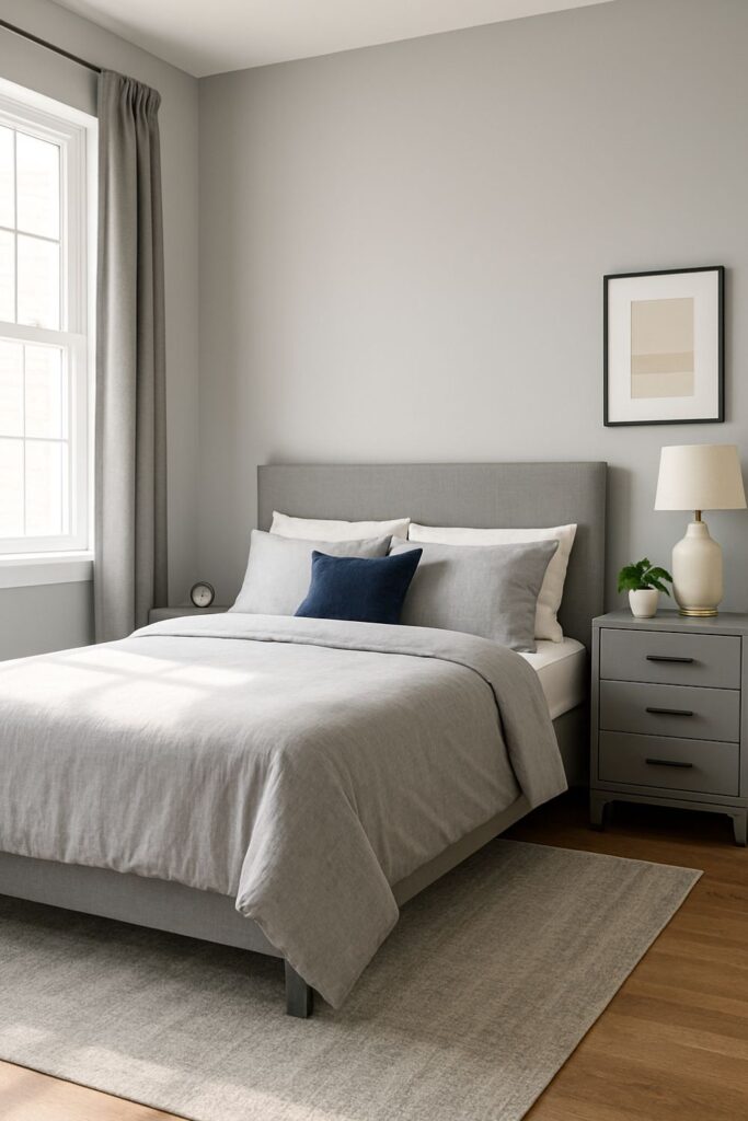 A gray dresser or bedside table adds subtle color without drawing too much attention. Stick with simple lines and matte finishes to keep the look clean and modern.
