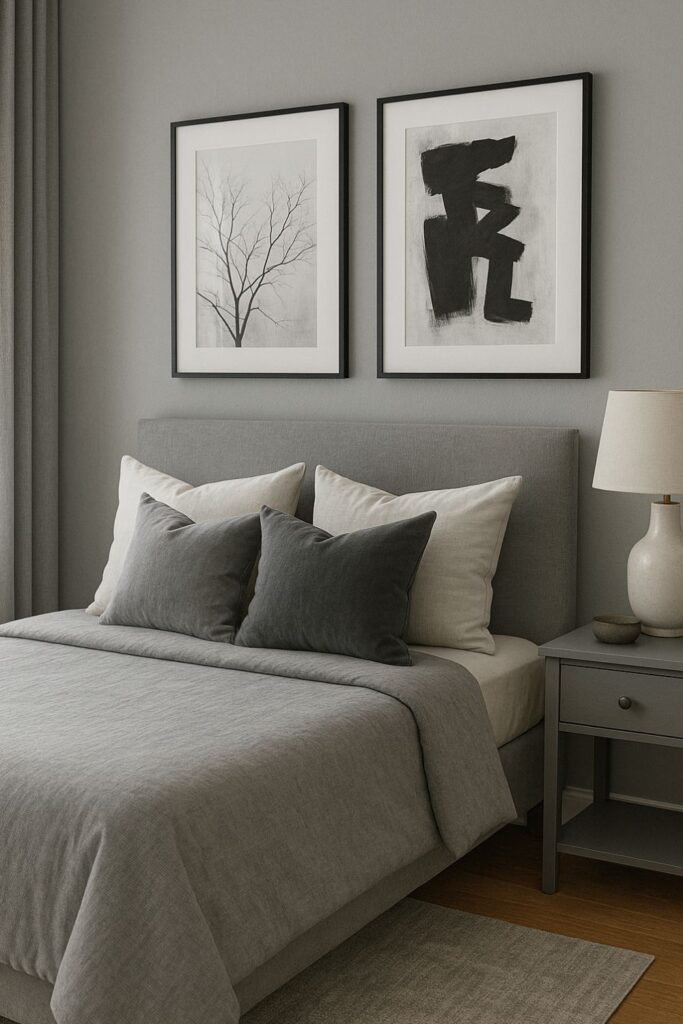 Grayscale artwork pops against mid-tone gray walls. Choose black and white photography, abstract prints, or soft charcoal sketches to reinforce the muted color story while adding visual interest.