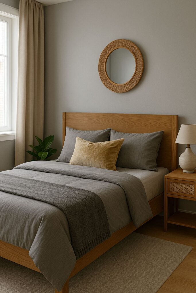 Mix warm-toned gray walls with oak, walnut, or rattan furniture to bring in a natural touch. This combination softens the coolness of gray and makes the space feel earthy and grounded.