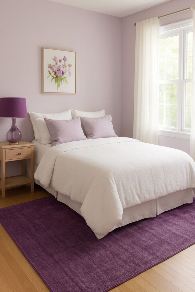 Ground your space with a purple area rug. Whether solid or patterned, it ties the color palette together while adding softness underfoot—a cozy bonus in any bedroom.