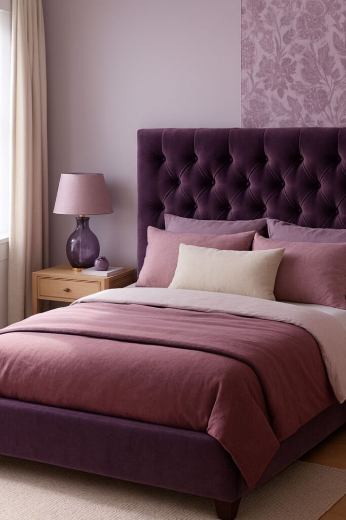 Velvet is the perfect texture to amplify purple’s richness. A velvet headboard, bench, or accent chair in lilac, aubergine, or berry tones instantly elevates the bedroom’s style.
