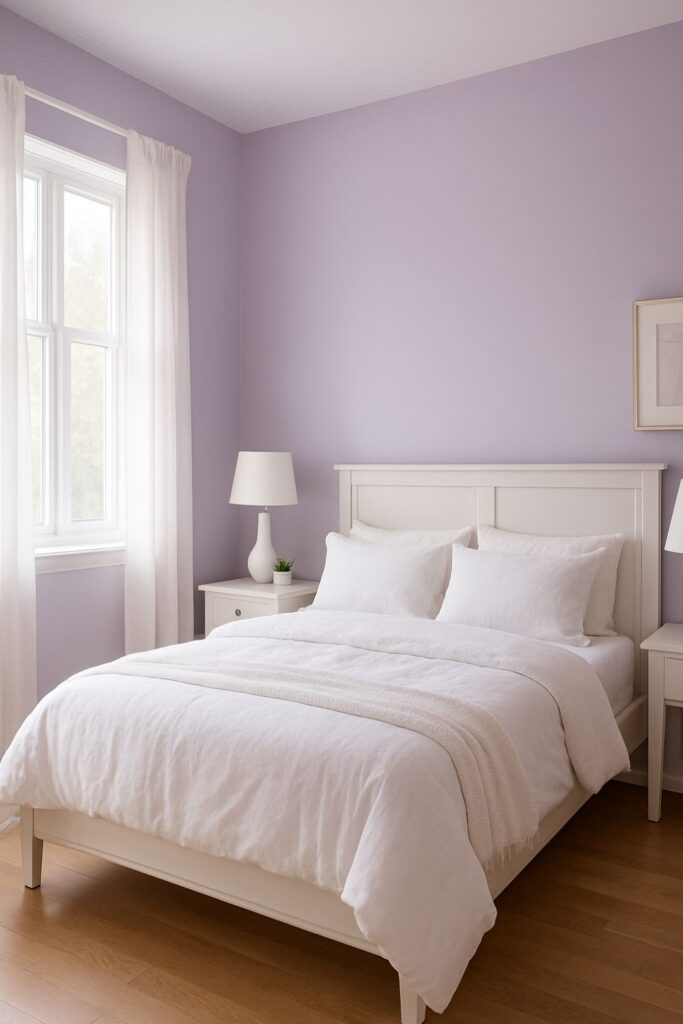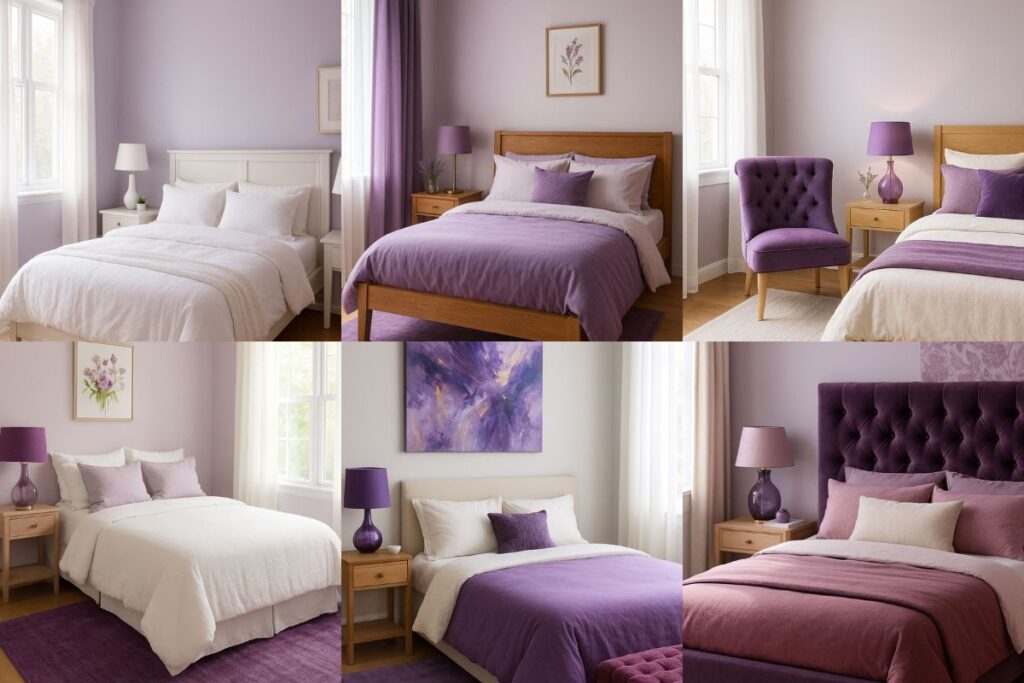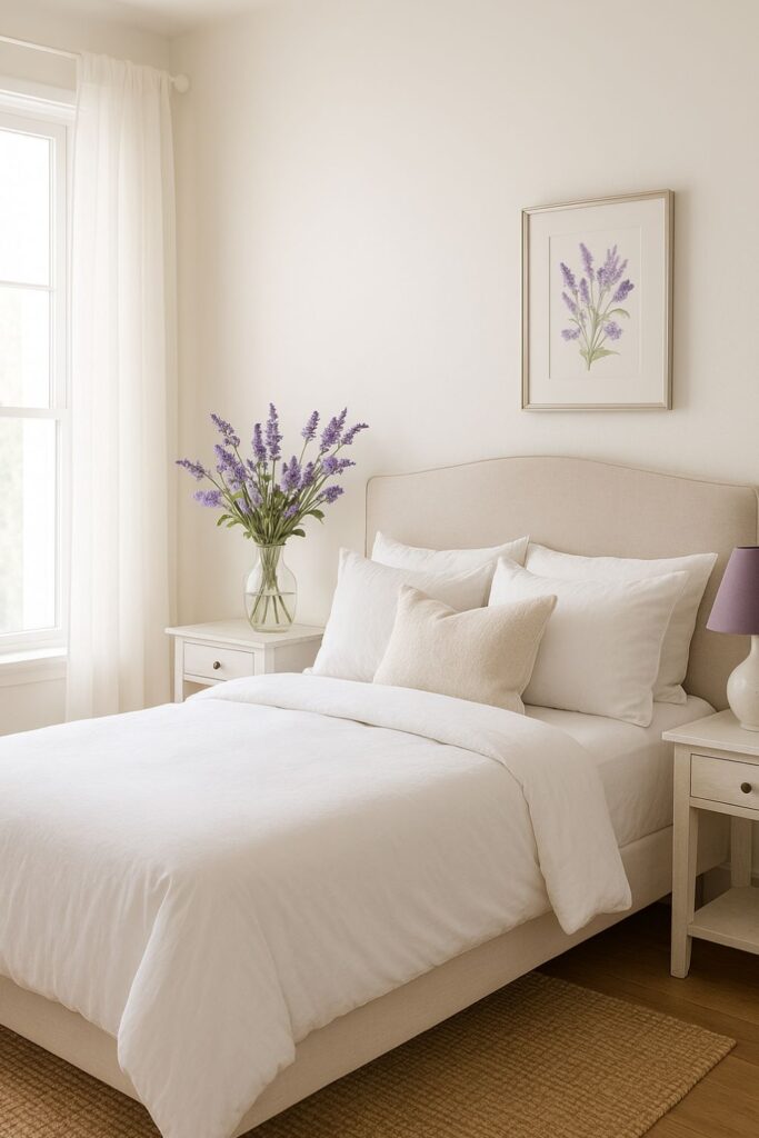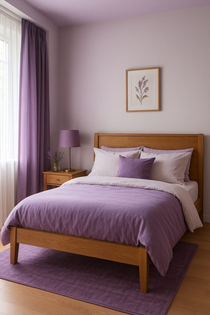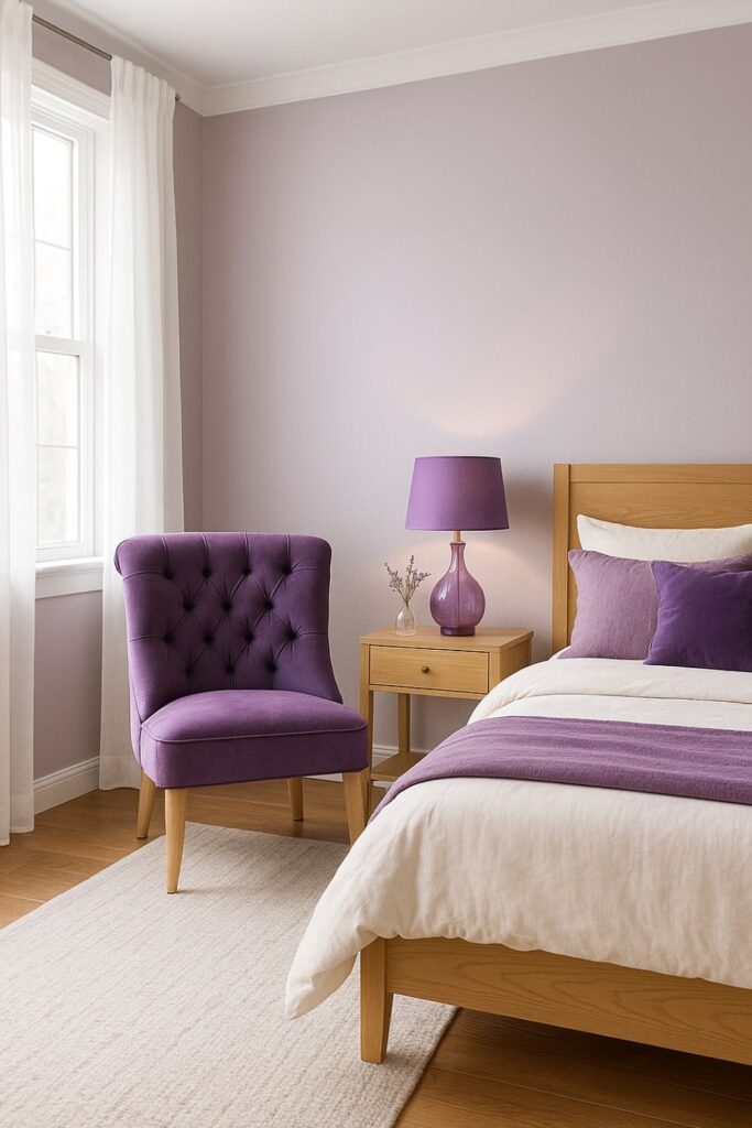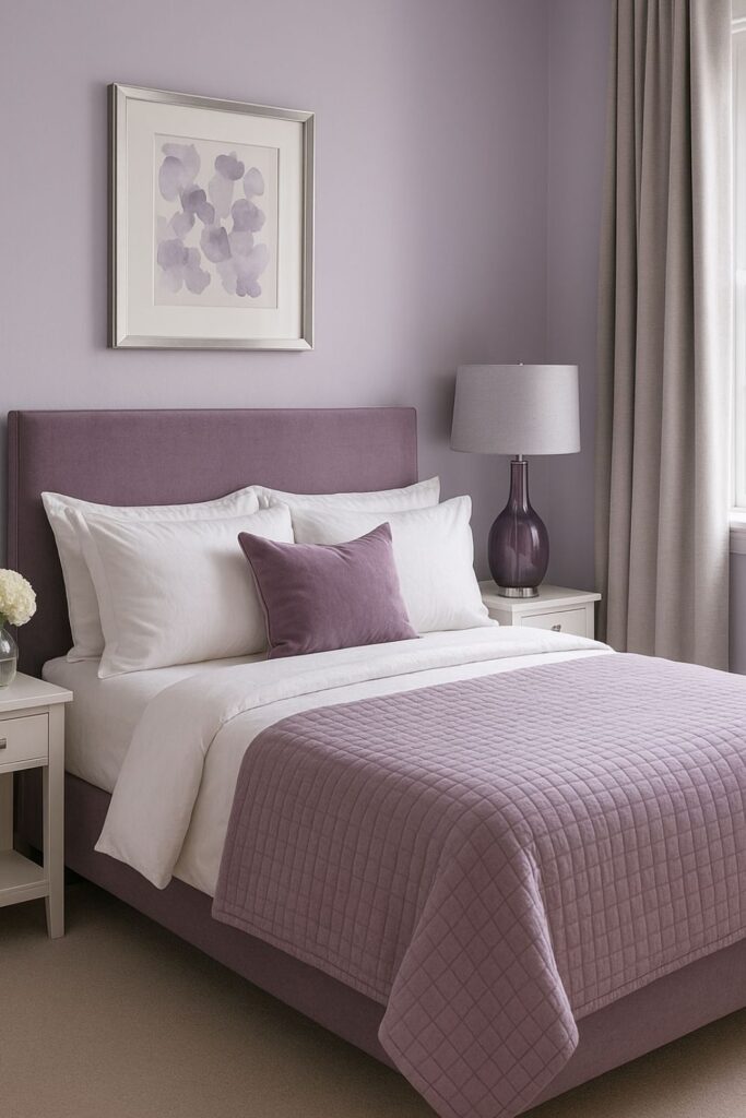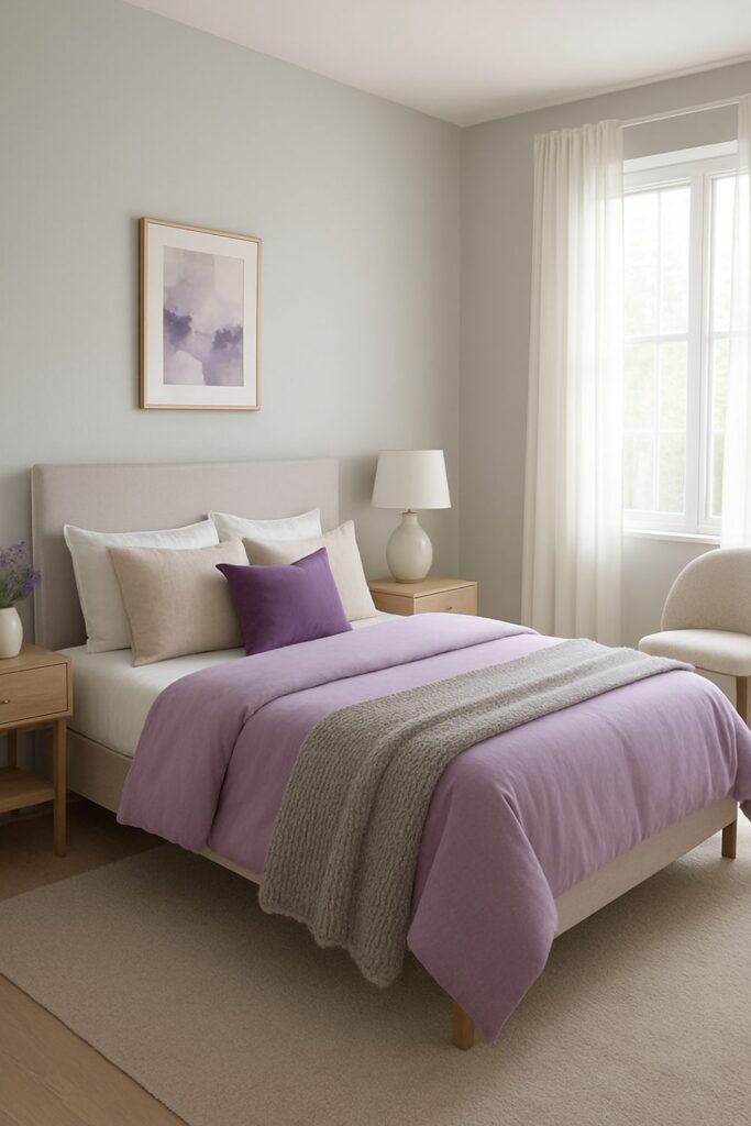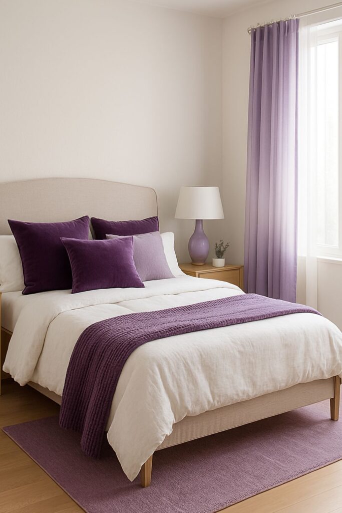 Too much purple can feel intense, so layer it with crisp whites, warm taupes, or soft greys. This combo keeps the room feeling open, relaxed, and dreamy—perfect for sleep and creativity.