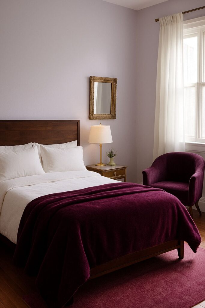 Add drama and luxury with deep plum touches—try a velvet chair, bedspread, or curtains. Pair with warm wood tones and metallic gold accents for a moody yet inviting look.