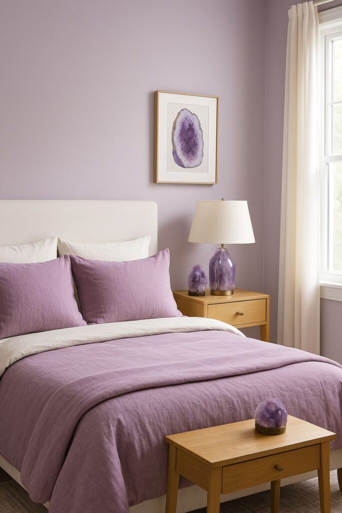 Channel crystal energy by incorporating amethyst-inspired elements like lamps, vases, or framed prints. These jewel-toned touches sparkle subtly and add a luxurious, spiritual vibe to the room.