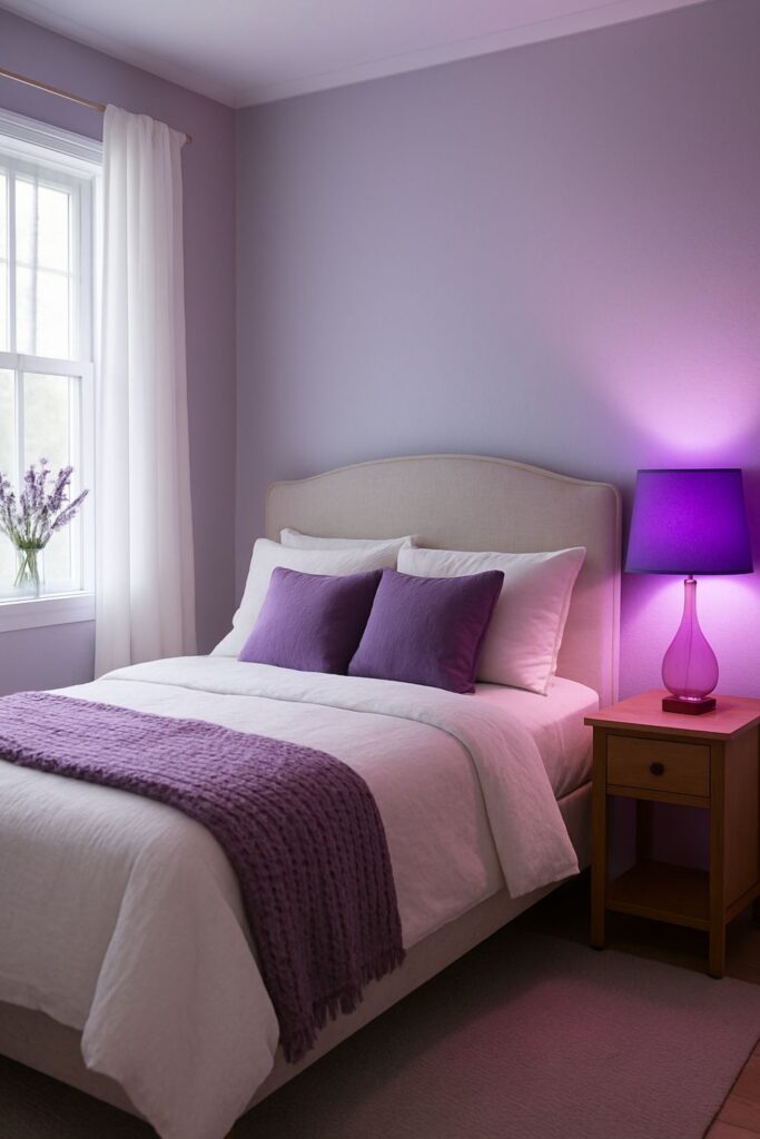 Try a bedside lamp with a purple shade or a colored LED light strip behind the headboard. Purple light adds a soothing glow, perfect for winding down in the evenings.