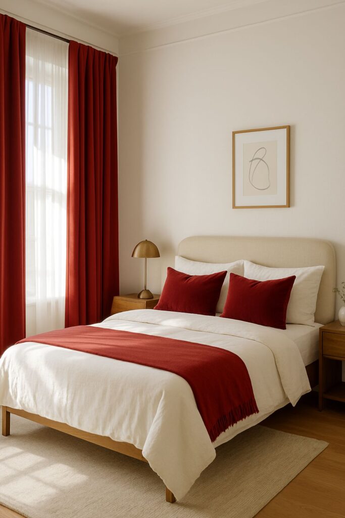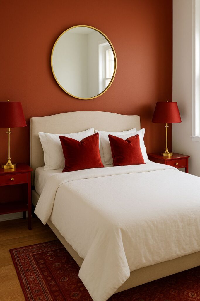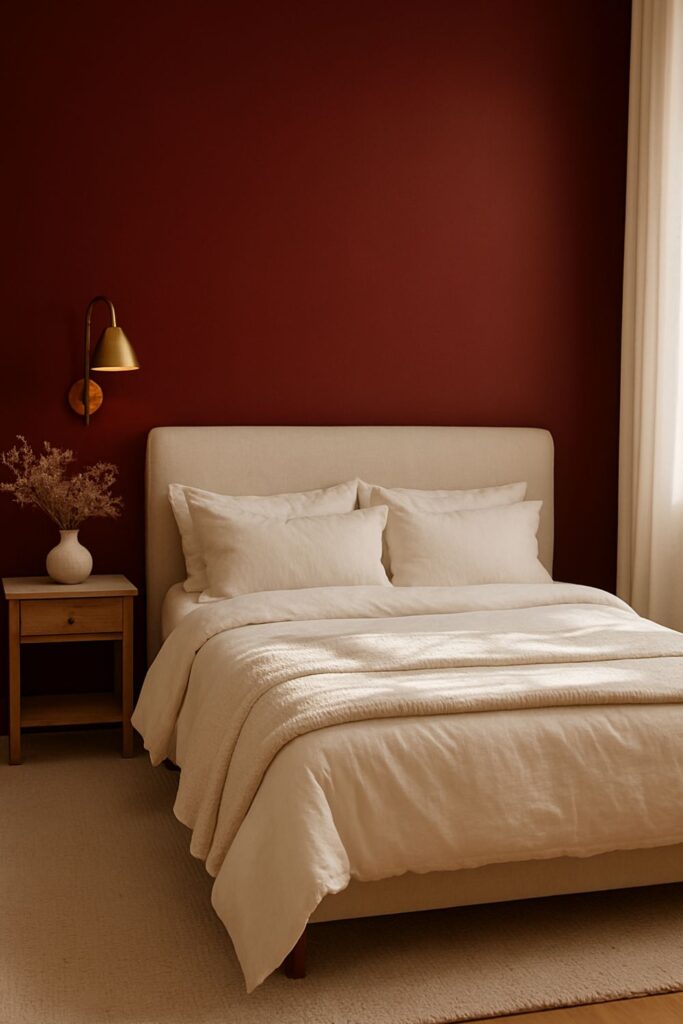 A deep crimson accent wall can bring warmth and richness to the room without overwhelming the space. Pair it with soft cream bedding and matte gold lighting for a cozy, elegant effect.