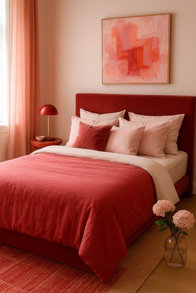 Soft pinks and blush tones soften the intensity of red and create a dreamy, romantic palette. Use this combo in bedding, throws, or wall art for a layered, feminine look.
