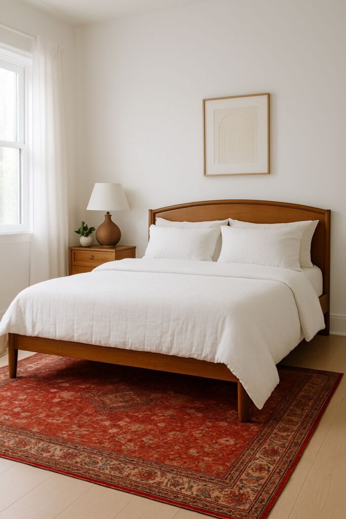 A bold red area rug adds warmth from the ground up. Try a Persian-style rug with intricate patterns or a modern solid one to add color without commitment to the walls.
