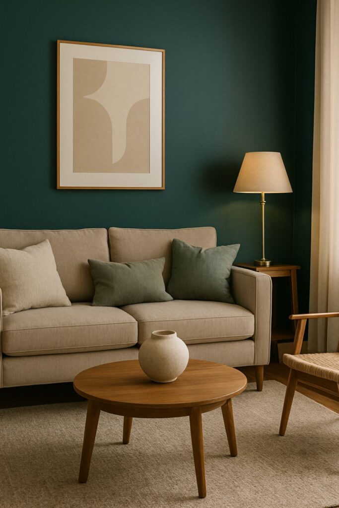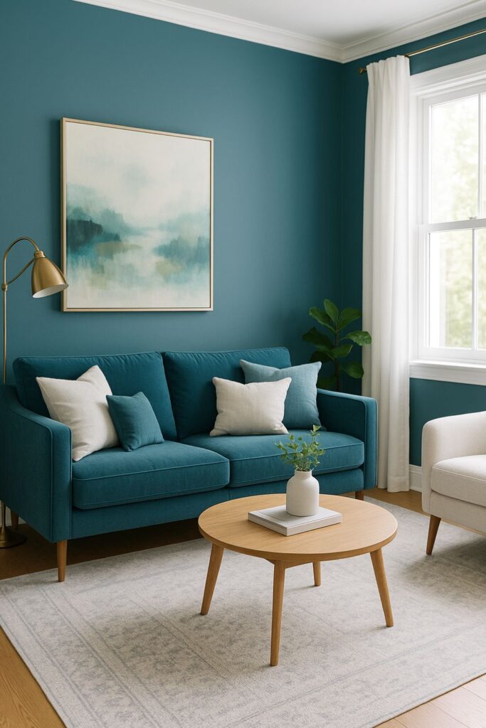 A single wall in deep teal can instantly ground your living room while adding a cozy, dramatic effect. It’s the perfect backdrop for lighter furniture or natural wood textures.