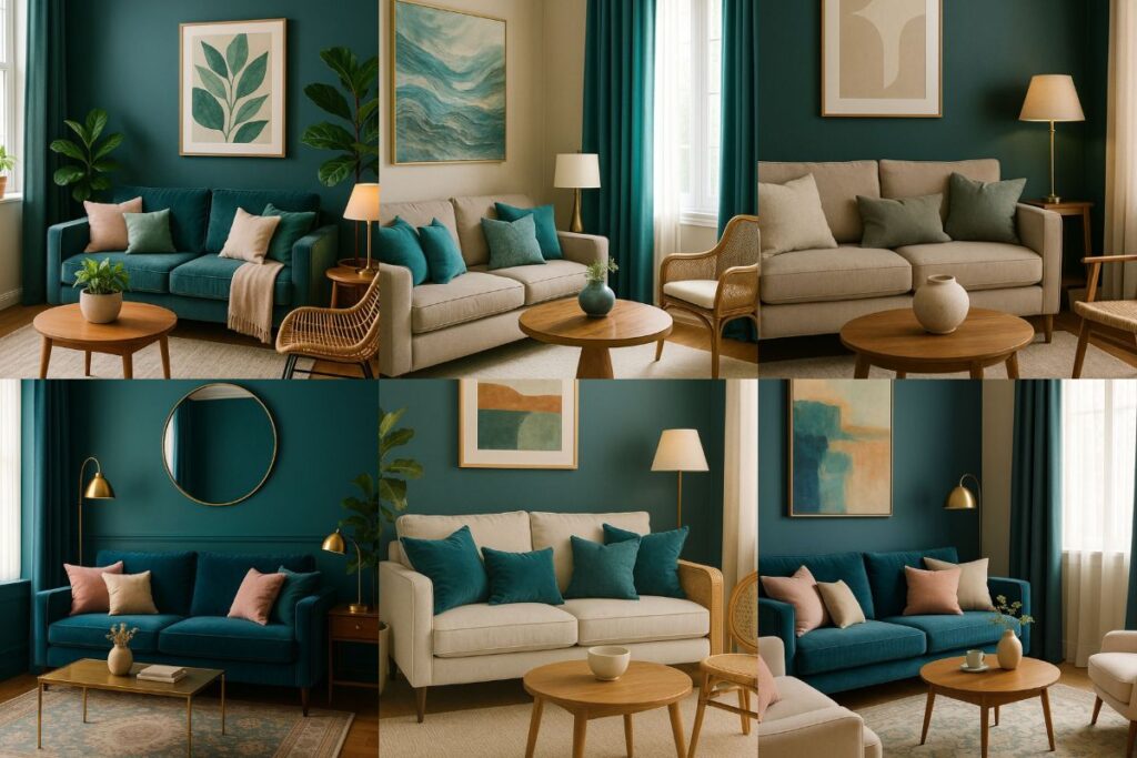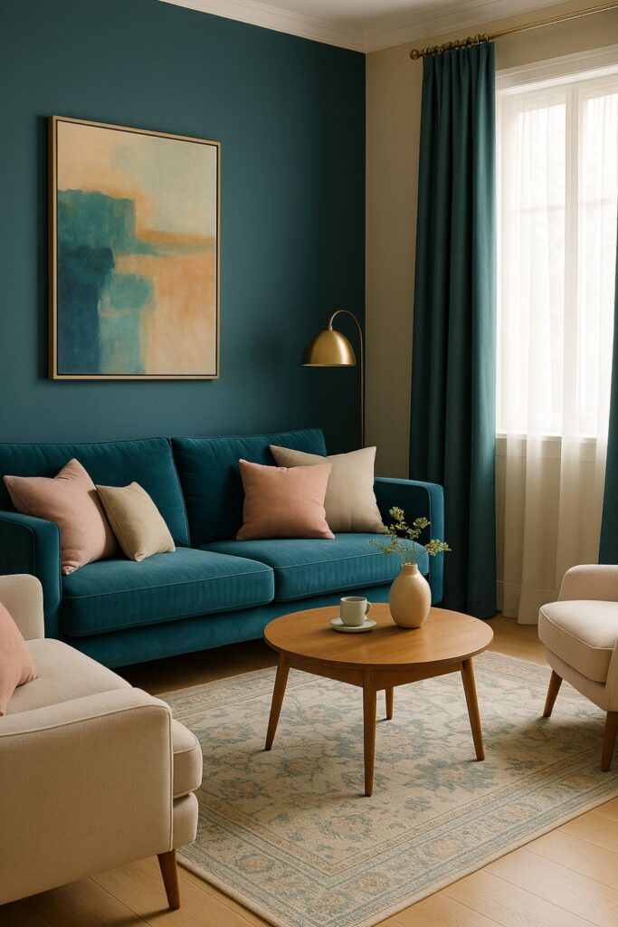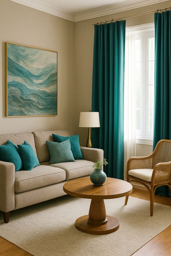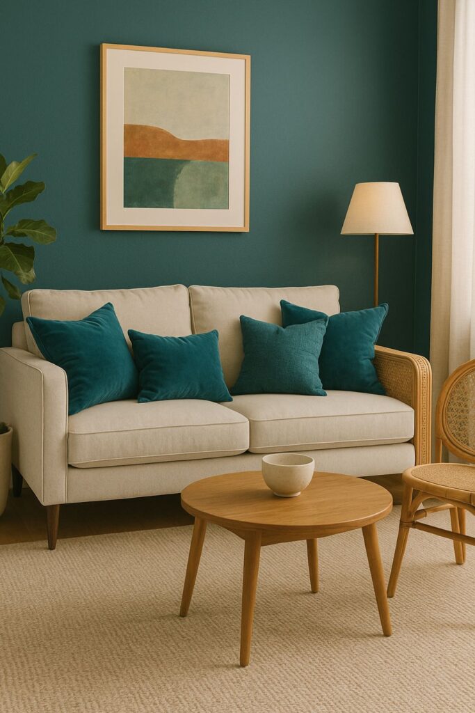 Balance teal’s cool undertone with warm, organic materials. A wooden coffee table or rattan side chair adds earthy charm and keeps the palette grounded and approachable.