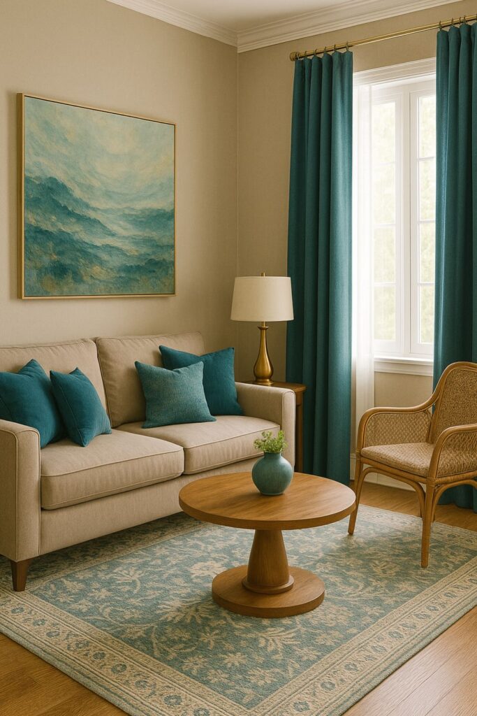 A rug with subtle teal elements can anchor your furniture and introduce the color without overwhelming the room. Look for botanical, geometric, or abstract patterns that tie everything together.